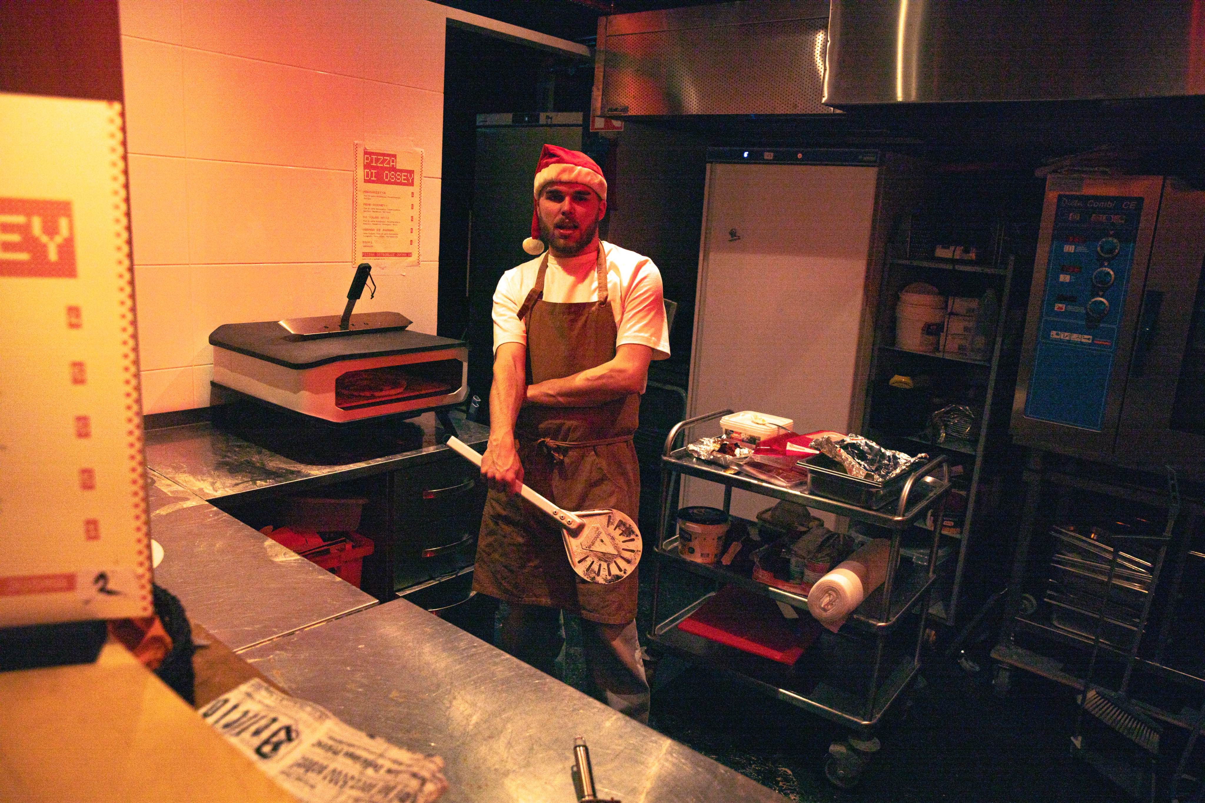 Allekirjoittanut itse keittiön puolella Pizzan paistohommissa