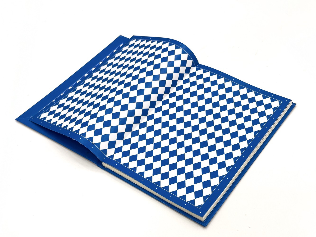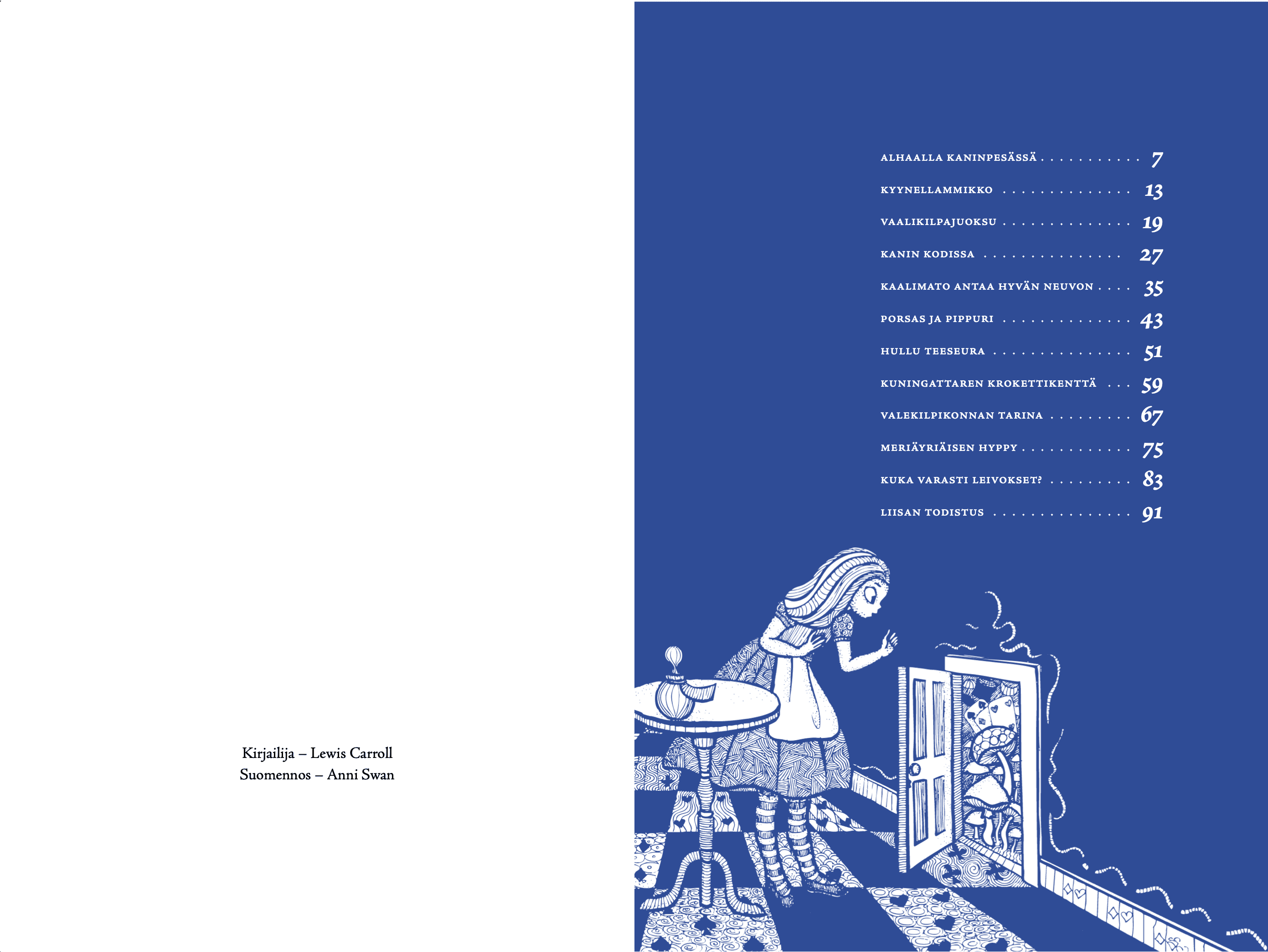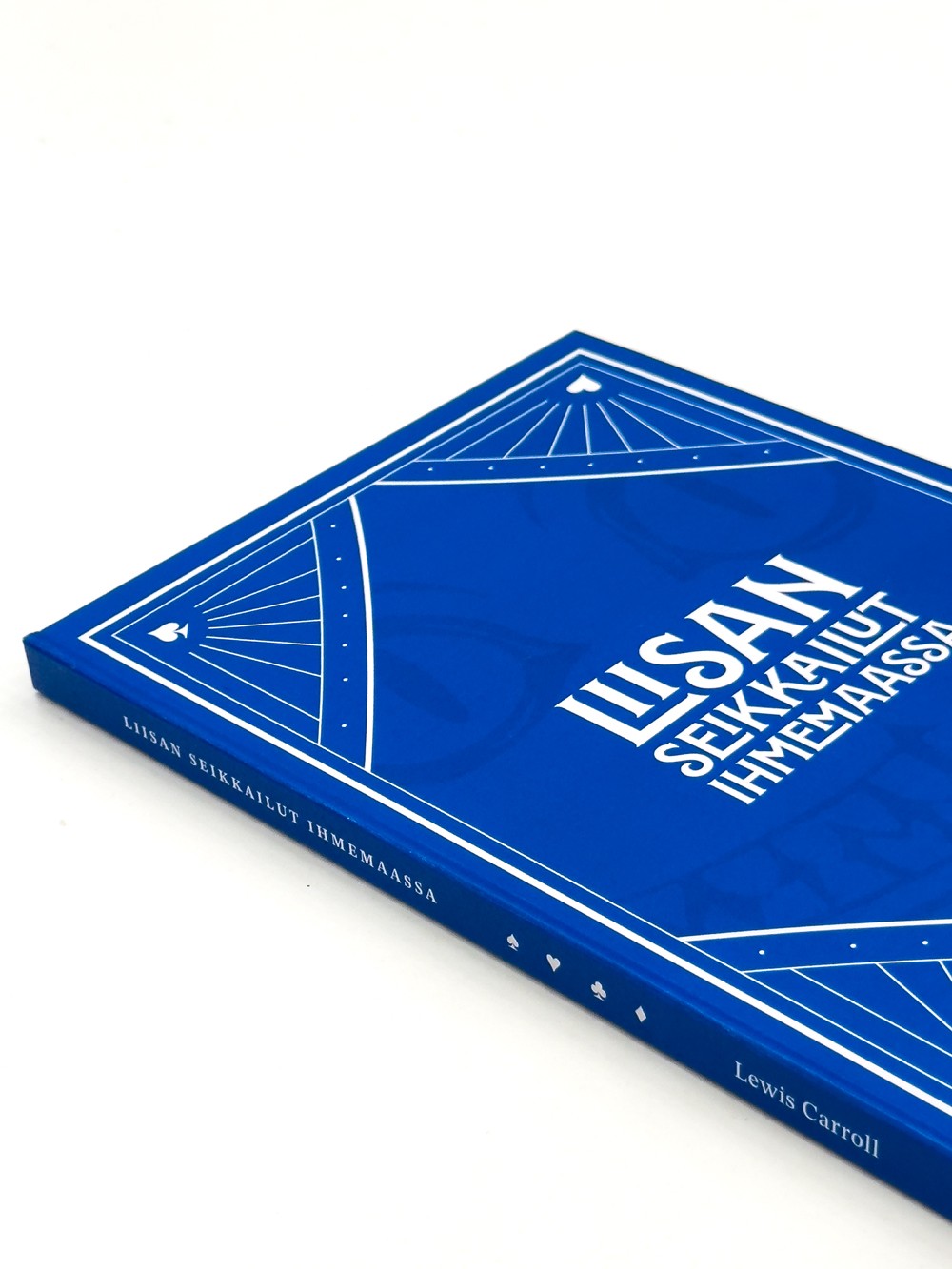 Layout and cover design exercise. The design process began with refining the typography, including adjustments to column width, typeface selection, point sizes, and line spacing, in order to achieve a balanced and visually harmonious result. The cover design aligns with the theme of the story through its playing card–inspired style and playful headline typography. Munken Pure 100 gsm paper, 152.4 mm x 228.6 mm. Cover: Cobalt blue book cloth, with graphics applied using a silkscreen printing technique. Binding: Hardcover, perfect bound, square spine.